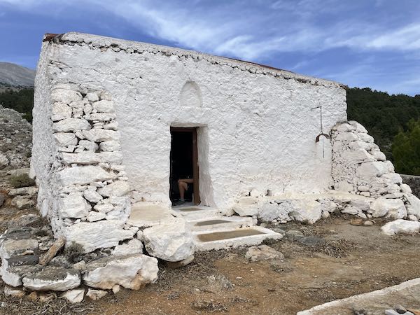 We arrived at the Cave of Kormokopos where a spring provides cool water. I didn’t drink any but I did pour some over my head for refreshment. The place is used by shepherds to look after their flocks and pen them in. Hornets buzzed in and out of the cave. I wondered whether the place had any spiritual history.