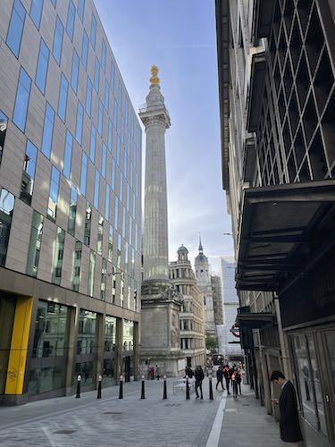 After we had finished our usual chat to catch up with the latest gossip in our lives we started on our walk which began at The Monument. The tower which is some 600 ft high has over 320 steps to the top. We didn’t try and reach the summit, we stayed at the bottom and read the text on the side of the monument underneath the relief showing King Charles II arriving to save the day and put out the fire.