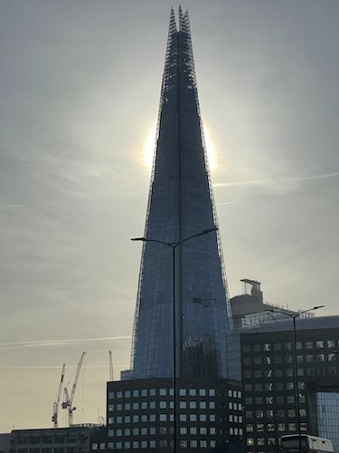 We crossed London Bridge, and as we did so we moved into the shadow of The Shard which stands as a monument to mammon. Rising high above the surrounding buildings its 3 projecting peaks pointing to the heavens trying to reach up ever higher.