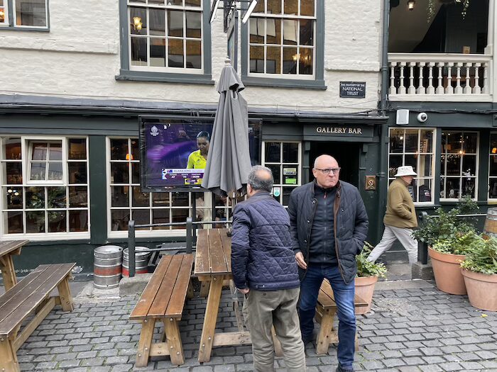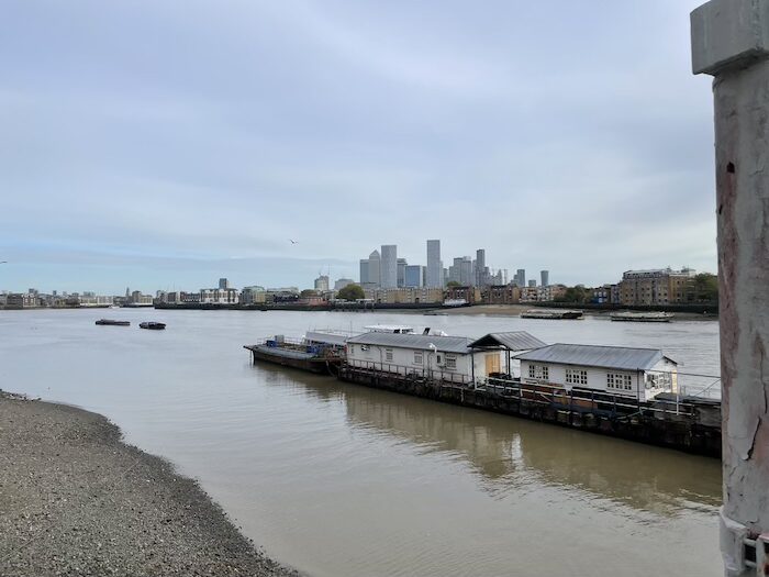 We returned to Wapping High Street with its wharf’s now converted to luxury flats and stopped in The Captain Kidd pub for a drink. I maintained my non-drinking policy for the day and had a J2O while Harry downed a pint. We met another three old guyers and chatted to them for awhile. Seated outside the five of us decided to leave when we felt a little rain coming down.
