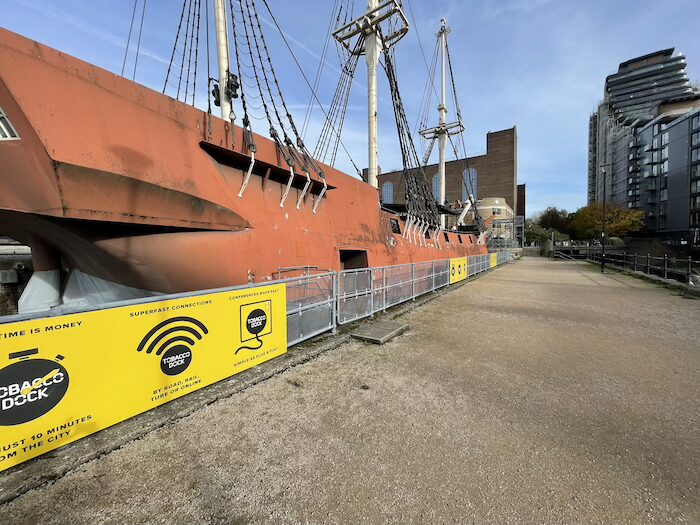 We retraced our steps passing by Tobacco Dock. When the dock closed some entrepreneur thought he could make a shopping centre of exhibition space, but the whole development looks like it will crumble down just as the dry dock boats are rusting outside the building.