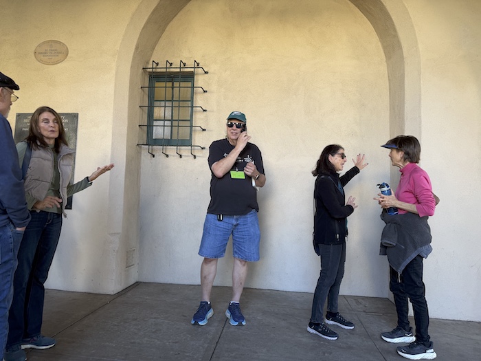 The sun shone and made for a very pleasant climb once we had passed through the trouble spots. We arrived at the park after about 40 minutes. Maggi spotted a sign for a free tram service to explore the park. We headed to the stop and waited a few minutes. The friendly driver said he woul wait a couple of minutes for the man crossing the car park. “That man knows all about Balboa Park” the driver declared.